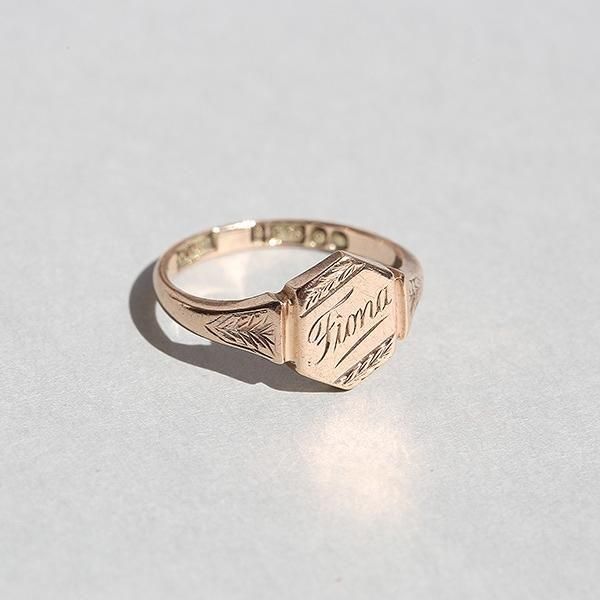 オクタゴンシェイプのフェイスには、流れるような筆記体で「Fiona」と刻まれています。サイドには繊細な彫金がさりげなく入り、クラシックな佇まいに程よいアクセントを添えています。イエローゴールドの柔らかな色合いが手元に馴染み、控えめながらも存在感を放つリングです。内側にW.W.LDメーカーマーク、9、・375(9金純度マーク)、ロンドン豹アッセイオフィスマーク、1958年のデイトレターの刻印が押されています。これらは貴金属の純度を検査するイギリス政府の公認機関ロンドンアッセイオフィスのホールマークです。状態は目立つキズや破損もなく良好な状態です。年代物になりますので細かな擦れ、細かなキズなどがございます。 予めご了承下さい。