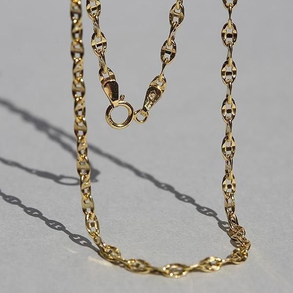 センターリンクに施されたカットが光を反射し、角度によって表情を変える9CT(9K)ゴールドのマリーナチェーンネックレス