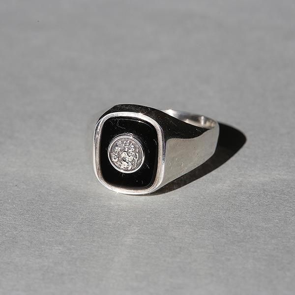 クッションシェイプのブラックオニキスをベースに、中央には守護聖人セントクリストファーを象ったメダルモチーフを配した、1981年イギリス製のスターリングシルバー・シグネットリング