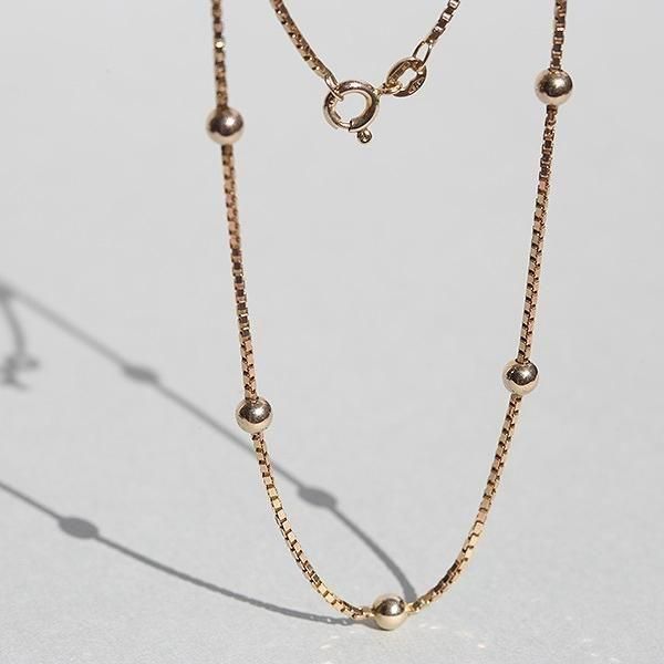 ツイストを効かせたダブルカーブチェーンに、等間隔で配された3mmボールをアクセントに加えた9CT(9K)ゴールドチェーンネックレス