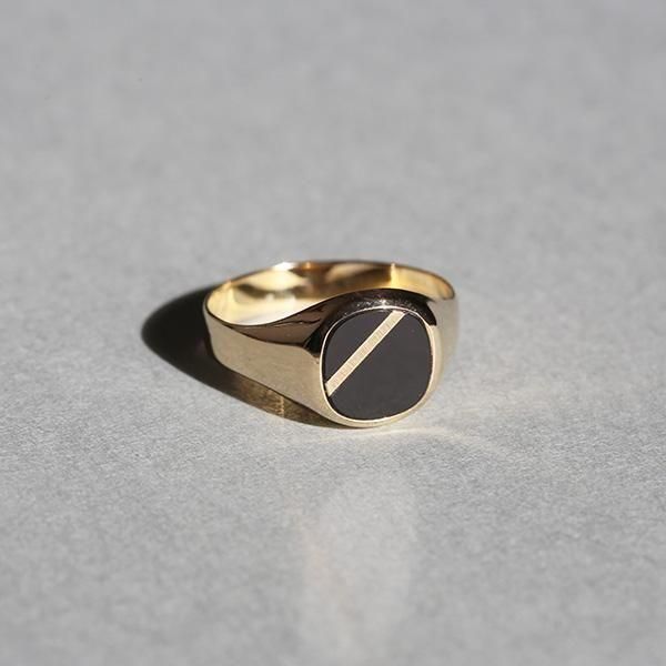 クッションカットのブラックオニキスに、斜めのゴールドラインがアクセントとして入った 9CT(9K)ゴールドのシグネットリング。控えめながらも存在感のある、洗練されたデザインです。内側にEDメーカーズマーク、375ゴールドコントロールマーク、375(9金純度マーク)、バーミンガム錨アッセイオフィスマークの刻印が押されています。これらは貴金属の純度を検査するイギリス政府の公認機関バーミンガムアッセイオフィスのホールマークです。デイトレターが無いため、比較的新しい年代のお品となります。状態は目立つキズや破損もなく良好な状態です。なおユーズド品につき、擦れや細かなキズが見られる場合がございます。あらかじめご了承ください。