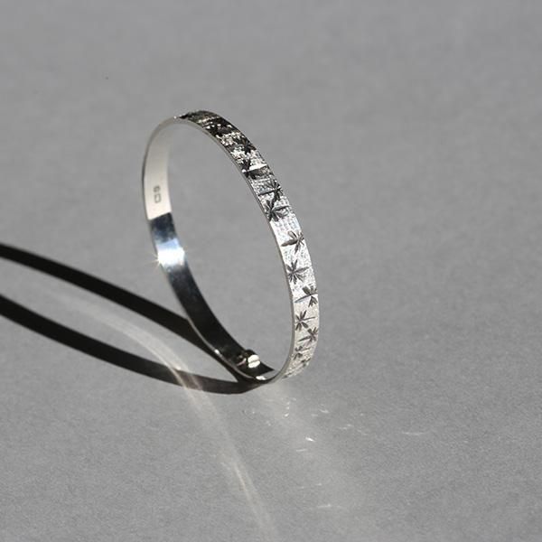 This vintage sterling silver bangle was hallmarked at the Birmingham Assay Office in 1976. The surface is decorated with fine star-cut detailing, creating a gentle shimmer as it catches the light — an elegant, feminine piece with a refined presence. Its slim silhouette makes it easy to wear on its own or layered with other bangles and bracelets.